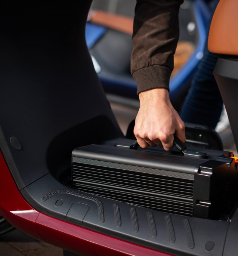 Elektrický skútr je vybaven dvěma bateriemi, které jsou součástí dodávky, a je navržen tak, aby se přihrádka na baterie nacházela ve spodní části skútru. Díky tomu máte nejen dostatek prostoru pro uložení věcí pod sedadlem (27 l), ale také co nejníže položené těžiště. Díky tomu budete mít při jízdě větší stabilitu a bezpečnost.