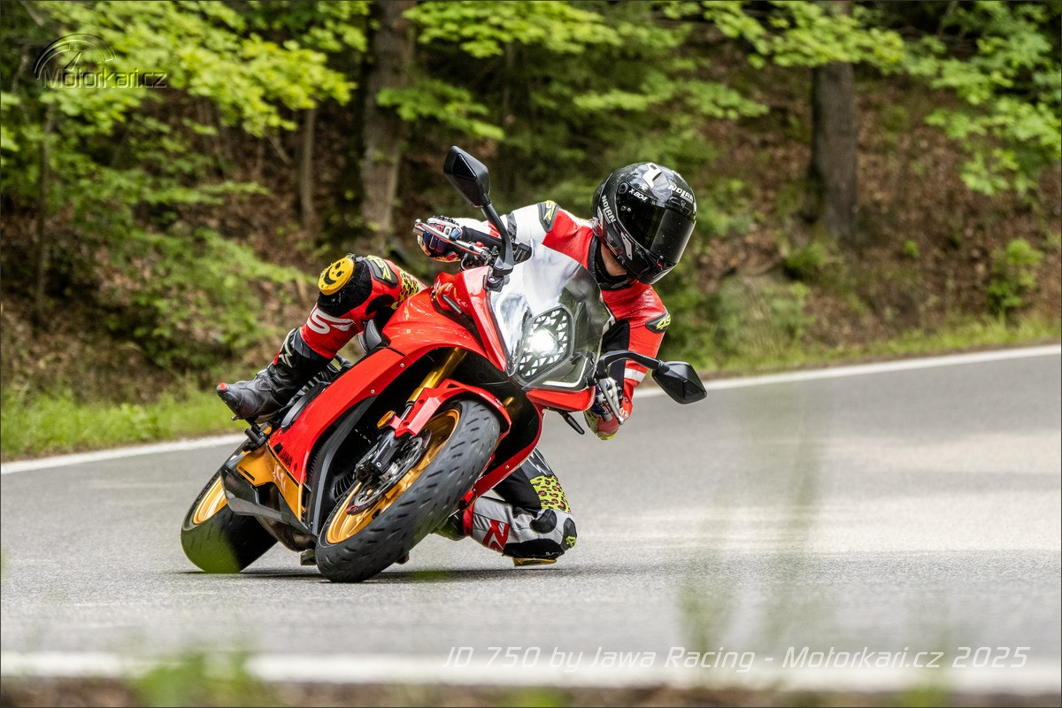 Jawa JD 750 Racing je přesně ten typ motorky, na které se ráno těšíte do práce a odpoledne si to omylem prodloužíte o pár zatáček navíc. Řadový dvouválec 730 cm³ táhne čistě od středních otáček a ve vršku zní, jako by chtěl ještě kousek navíc. Lehký předek ochotně padá do oblouků, nízké sedlo a úzká nádrž dávají jistotu i menším postavám.