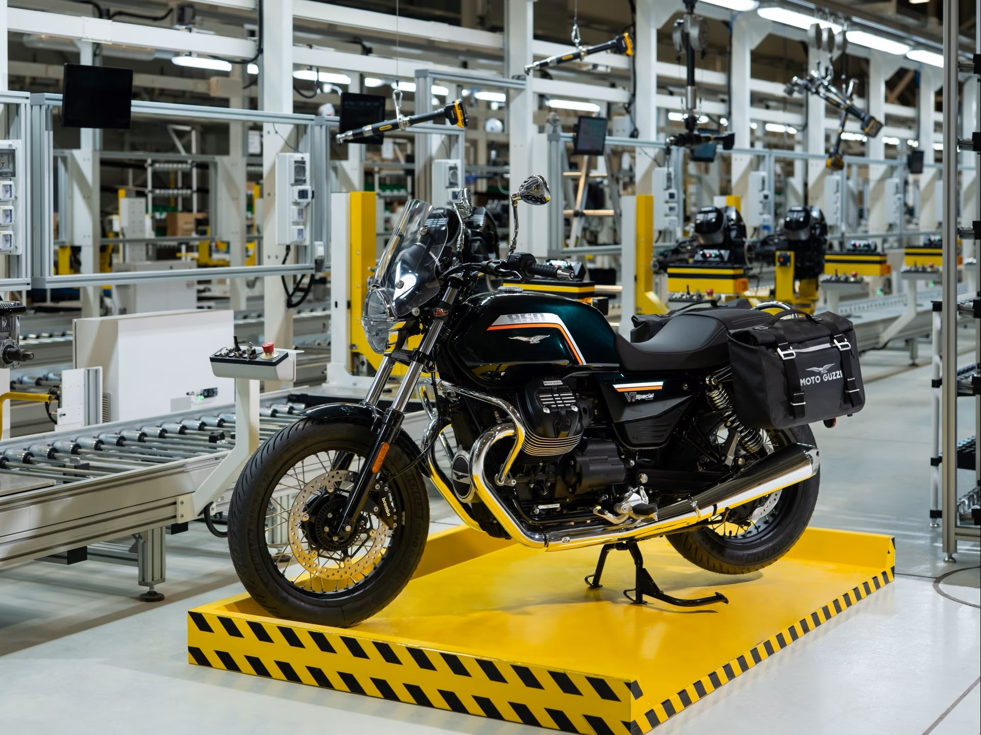 Ikonický design modelu V7 Special se projevuje chromovaným madlem spolujezdce, vyplétanými koly s lesklými kanálky a černými kryty nábojů, chromovanými světlomety a DRL světly, které vytvářejí nezaměnitelnou siluetu orla Moto Guzzi. Palivová nádrž o objemu 21 litrů, největší v kategorii, rámuje motor do V, zatímco krátký zadní blatník a koncovky výfuku dodávají elegantní vzhled liniím motocyklu. Frézované chladicí žebrování na hlavách válců a klíček zapalování s logem odrážejí legendární preciznost Moto Guzzi v detailech.