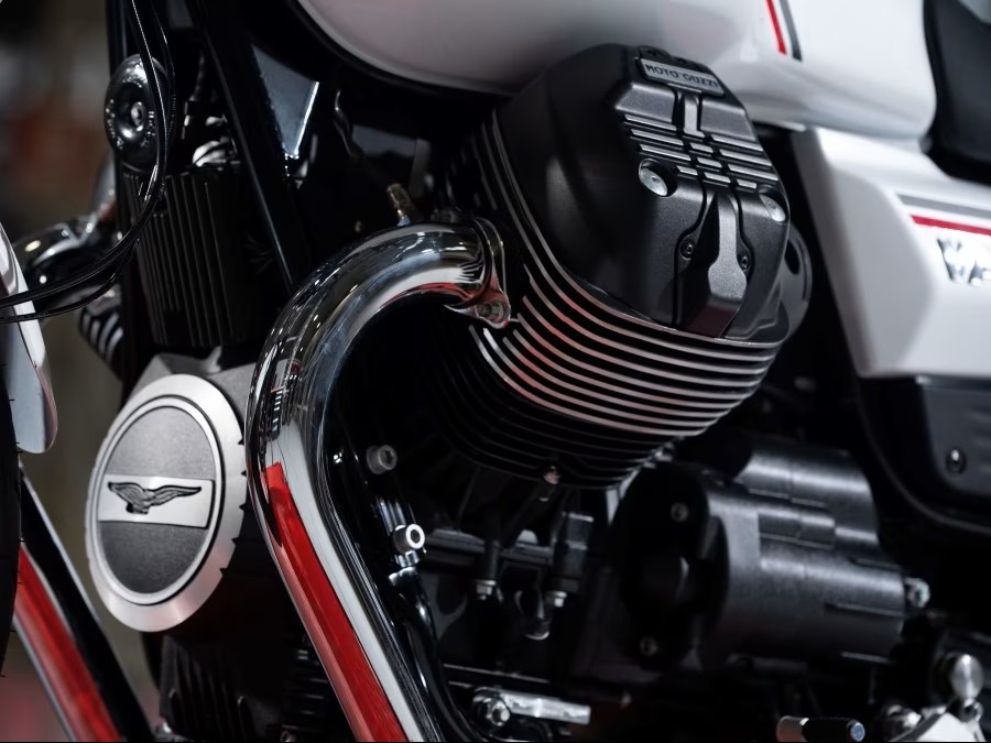 Vzduchem chlazený V-twin motor s úhlem natočení 90° a kardanovým pohonem, splňuje normu Euro 5+, má objem 853 cm3 a nabízí výkon 67,3 k při 6 900 ot/min a točivý moment 79 Nm při 4 400 ot/min. Vyniká zejména ve středních a nižších otáčkách. Jednoduše řečeno – pokročilý výkon, vyšší účinnost a samozřejmě nezaměnitelný zvuk Moto Guzzi.