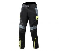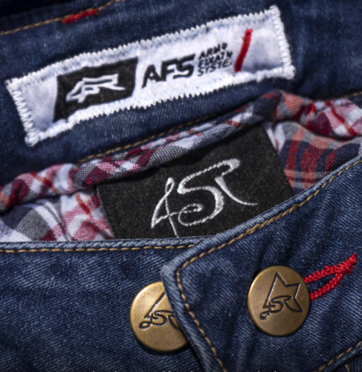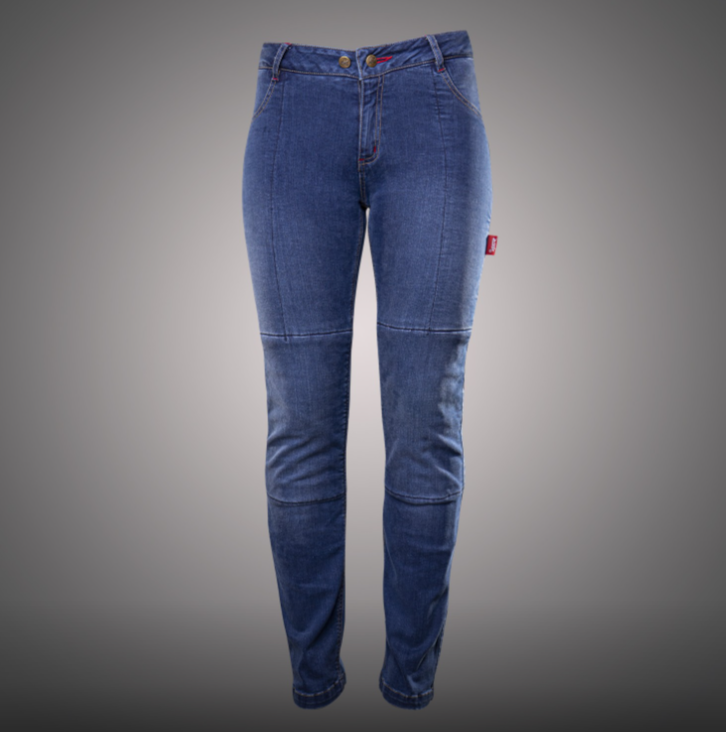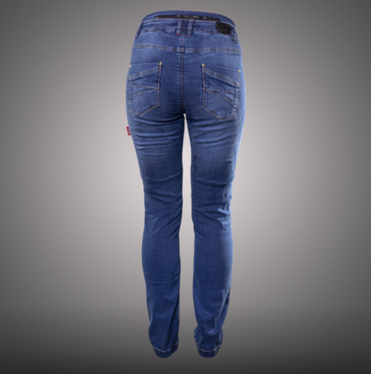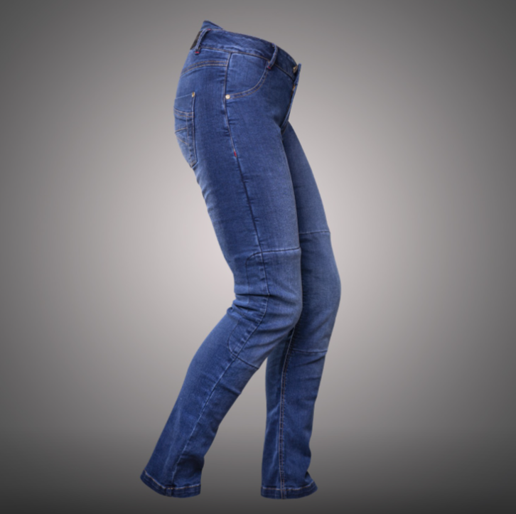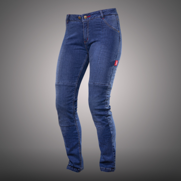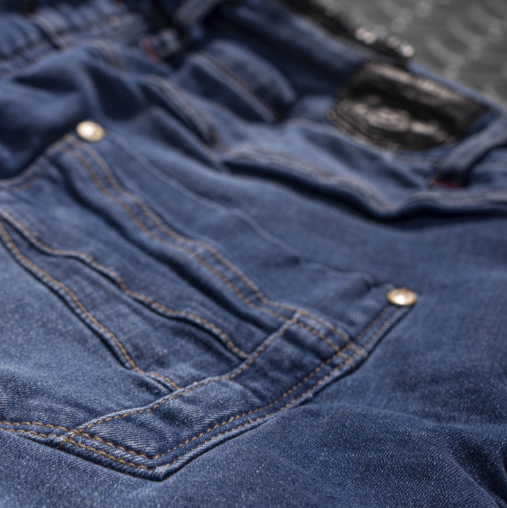 Džíny jsou na kolenou, bocích a v sedací části zesíleny tkaninou Kevlar® od Dupont pro další ochranu. Zašité přední kapsy nekazí siluetu postavy a zvýšený pas spolu se zipem na sepnutí s bundou zvyšuje praktickost těchto kalhot.