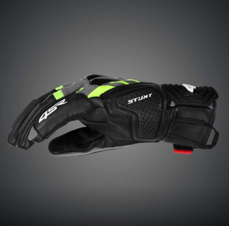 Rukavice Stunt Yellow jsou vybaveny flexibilním ochranným panelem kloubů z 3D tvarovaného silikonu a měkkou podšívkou pro pohodlí. Textilní kloubní spoje a spoje prstů poskytují lepší ventilaci. Manžetový lem je zdoben výrazným žebrovaným designem a 3D logem 4SR. Dostupné ve velikostech XS až XXL a splňují normu CE dle Nařízení Evropského parlamentu a Rady (EU) 2016/425.