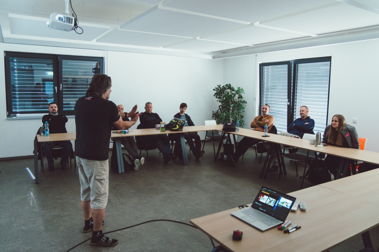 Dopoledne projdeme teorii (psychologie provozu, aktivní/pasivní bezpečnost, nejčastější krizové situace), odpoledne vyrazíme na okružní trasu 130–160 km s instruktorem. Během vyjížďky jsou jezdci instruktorem stručně upozorňováni přes intercom na krizové úseky nebo vlastní chyby. Při zastávkách jsou pak všechny situace prodiskutovány do detailu. Na konci získáte certifikát o absolvování.