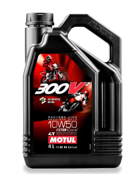 Motul 300V 4T Factory Line 10W-50 je prémiový plně syntetický motorový olej speciálně navržený pro čtyřtaktní motocyklové závodní motory. Tento olej využívá technologii ESTER Core®, která poskytuje maximální výkon a ochranu motoru i v těch nejnáročnějších závodních podmínkách. Je navržen tak, aby zlepšil odezvu plynu, snížil tření a opotřebení komponentů motoru, čímž přispívá k delší životnosti motoru. Olej je vhodný pro závodní i běžné použití a splňuje přísné požadavky pro sportovní i off-road motocykly.