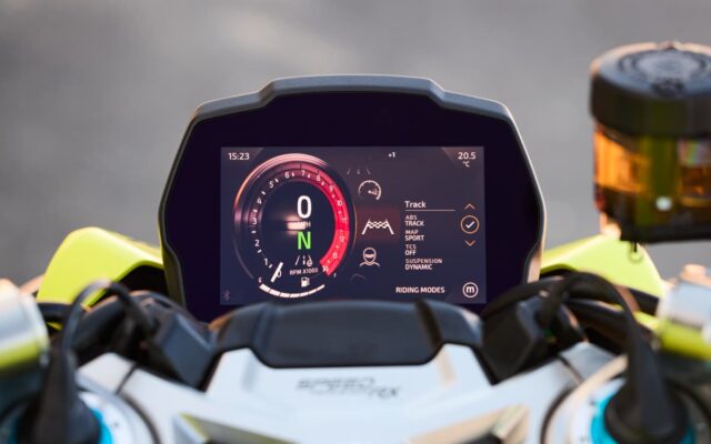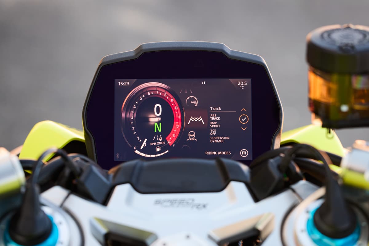 | Přední brzdy | Dva plovoucí kotouče 320 mm. Brzdiče Brembo Stylema monobloc OC-ABS, radiální brzdová pumpa |